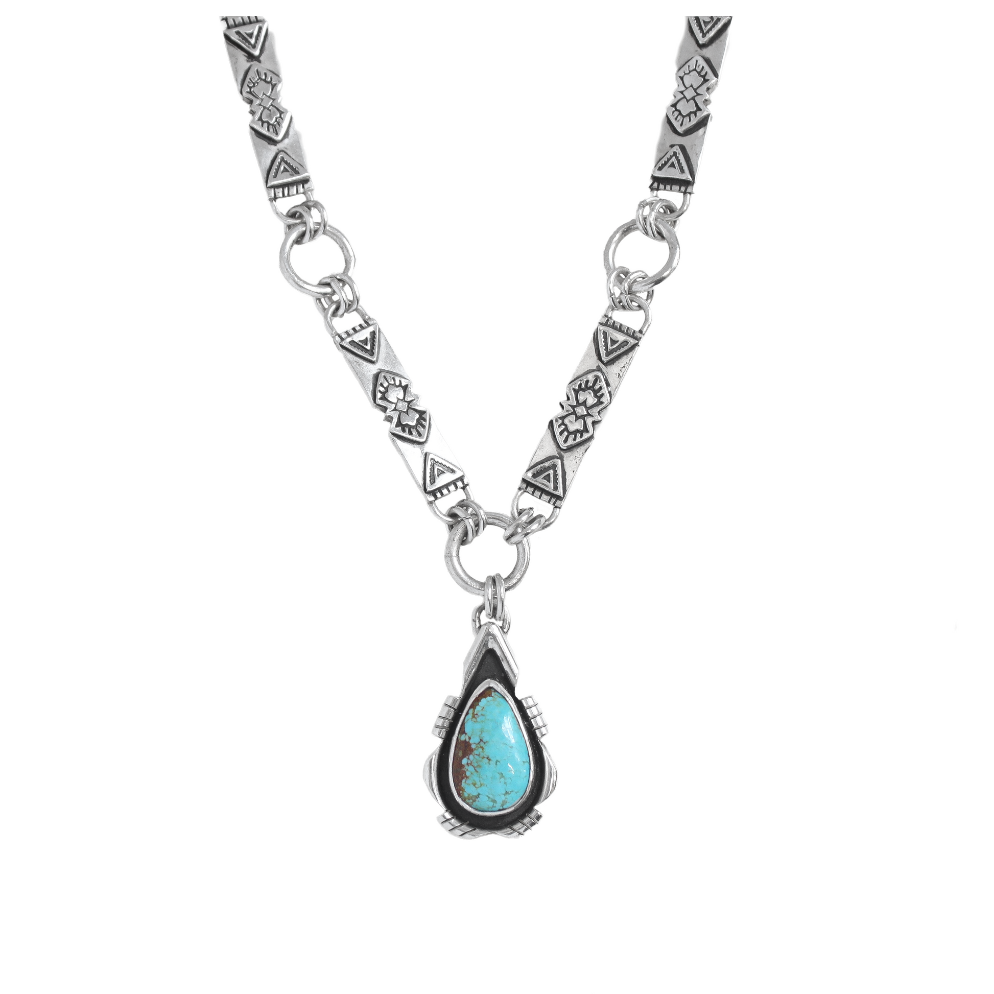 Where to begin with this necklace! Its pendant showcases a No. 8 Turquoise adorned with a finely hand-cut pattern. The bar chain complements it perfectly, crafted by hand with detailed and carefully cut designs. A true one-of-a-kind work of art that will be appreciated by every person you cross paths with.