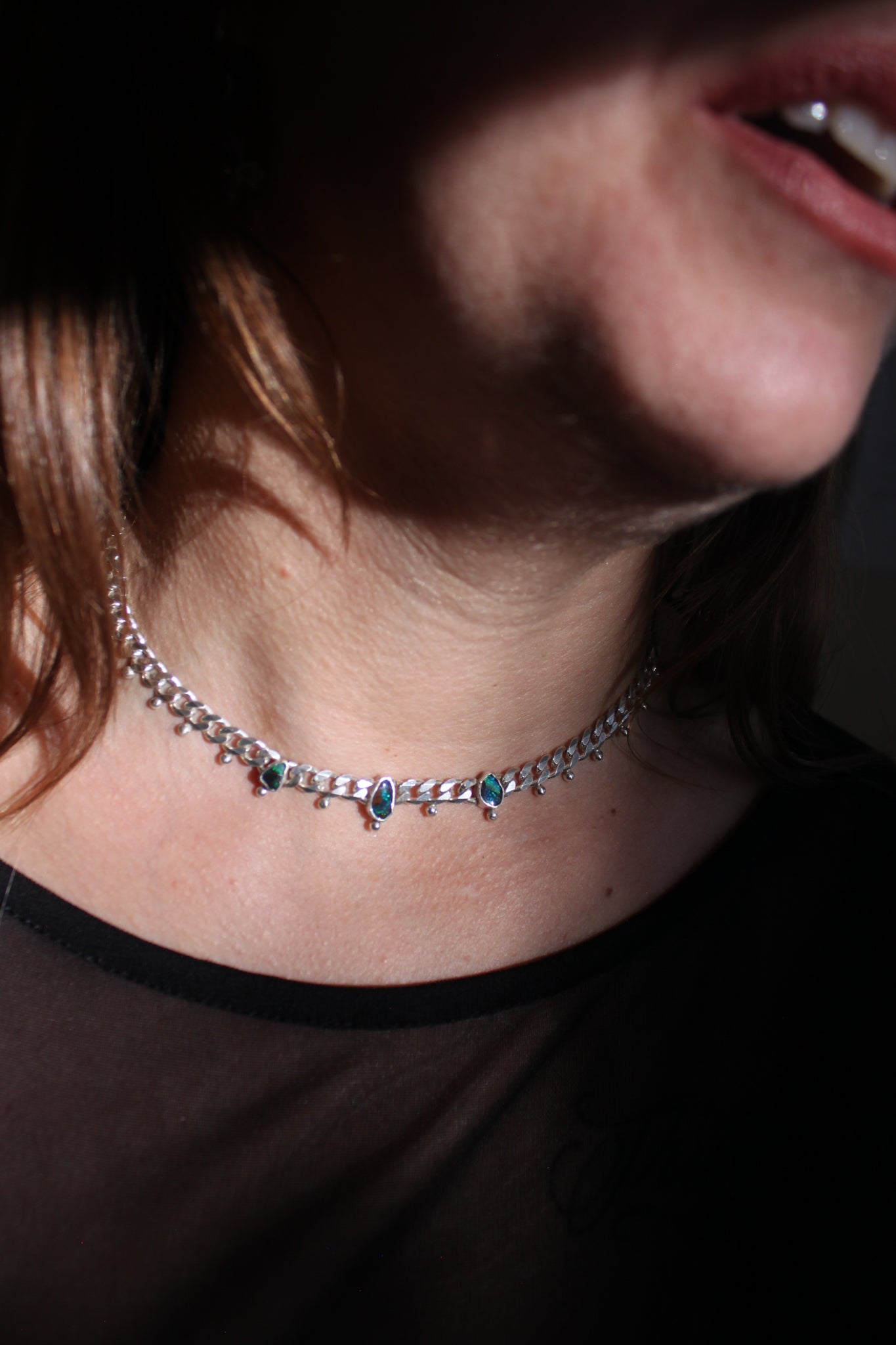 This choker features three stunning blue and green boulder opals nestled within a sturdy curb chain. It is substantial in weight, making it feel bold and silky-smooth against your skin.